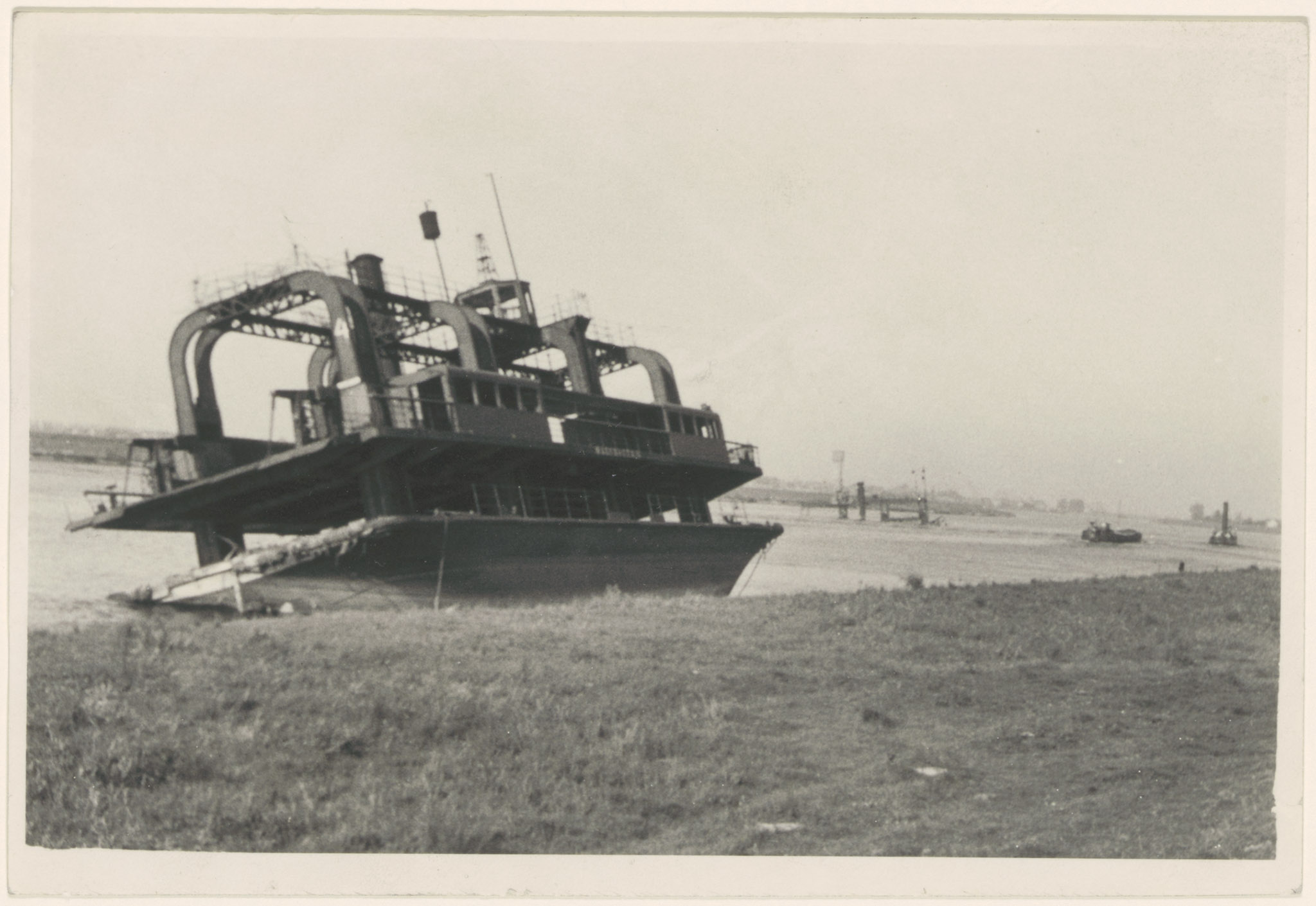 Door de Duitsers vernielde veerboot voor auto's in de Dordtsche Kil om een eventuele geallieerde opmars te bemoeilijken.