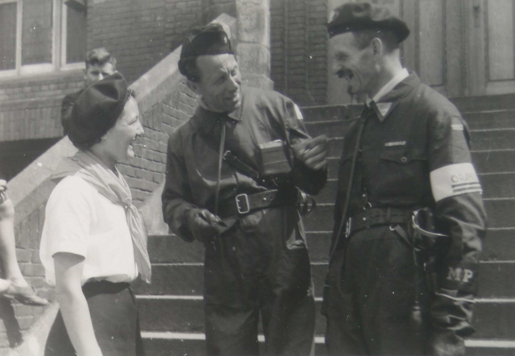 Leden van de Binnenlandse Strijdkrachten op trap van de MTS aan de Oranjelaan