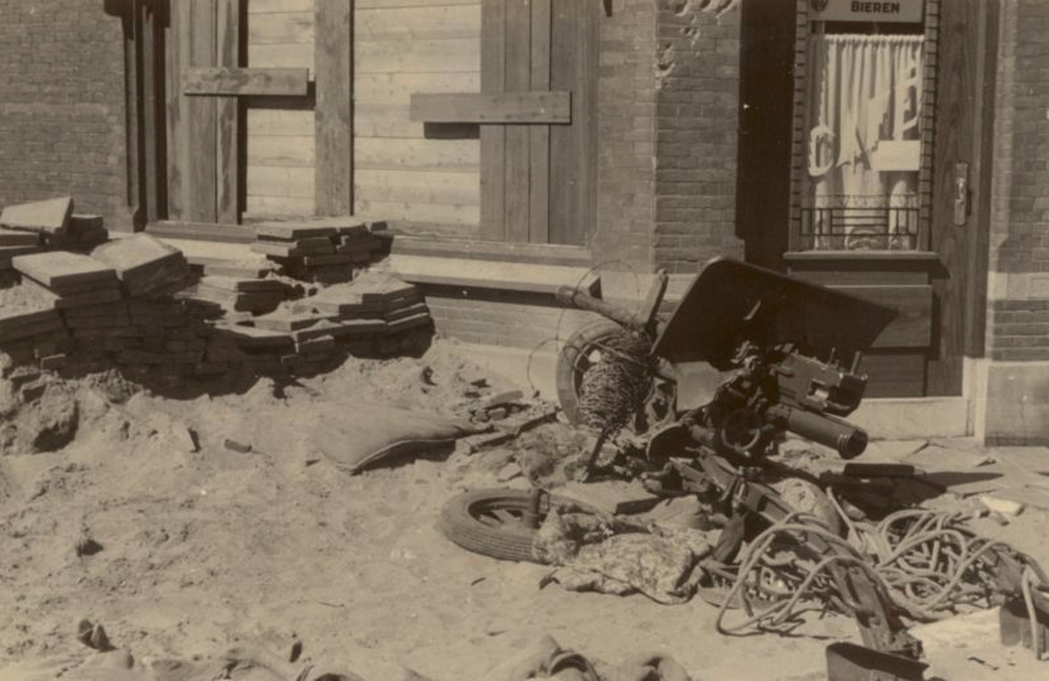 Nederlands Pantser Afweer Geschut (PAG) voor café Korndörfer op de hoek Spuiplein / Boogjes. na de gevechten in de meidagen 1940