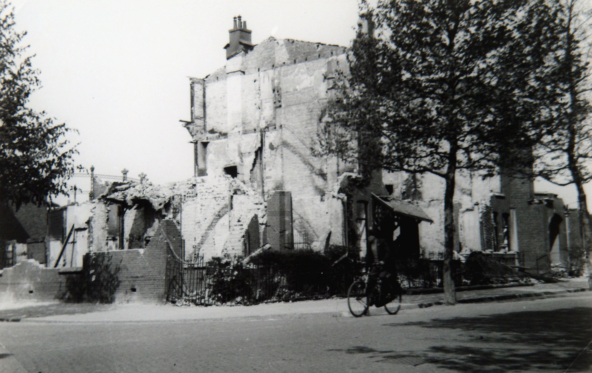 Door kanonvuur in mei 1940 beschadigde huizen aan de Dubbeldamseweg 25-35, tussen Mauritsstraat en Markettenweg.