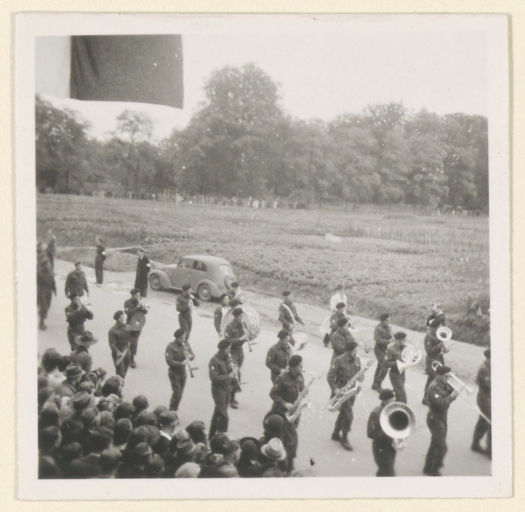 Een Canadees muziekkorps tijdens de bevrijdingsmars op de Krispijnseweg.