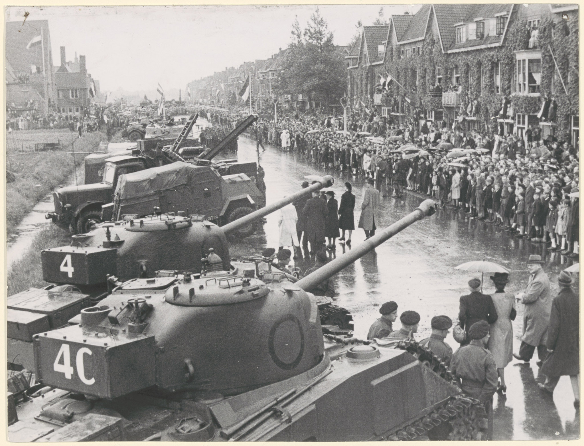 Militaire demonstratie met Canadees materieel op de Krispijnseweg tijdens de bevrijding.