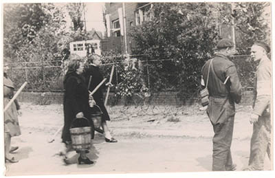 De bestraffing van enkele moffenmeiden: kaalgeschoren meisjes met emmers en bezems op weg naar een schoonmaakactie in het Oranjepark begeleid door de Binnenlandse Strijdkrachten.