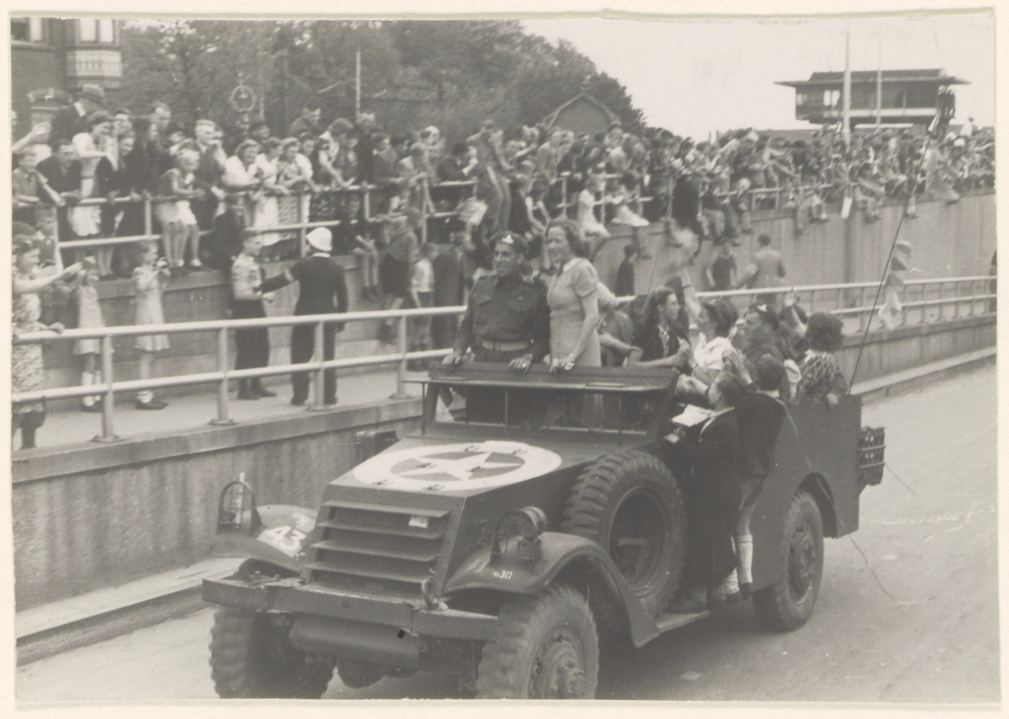 De eerste voertuigen van de bevrijders, die via Moerdijk in Dordrecht aankomen, in de Krispijntunnel...
