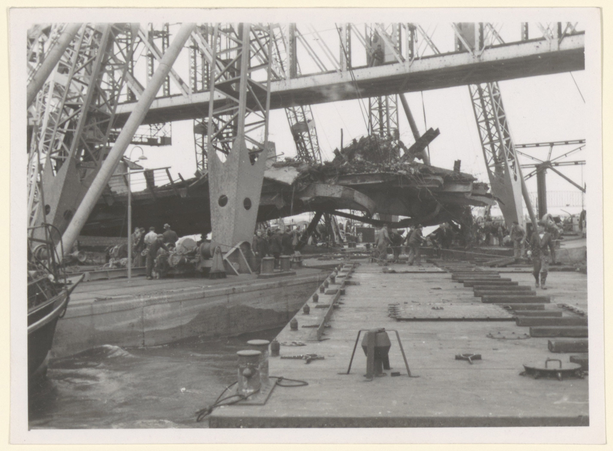 Het verwijderen van een vernield brugdeel tijden de Tweede Wereldoorlog van de verkeersbrug Moerdijk.
