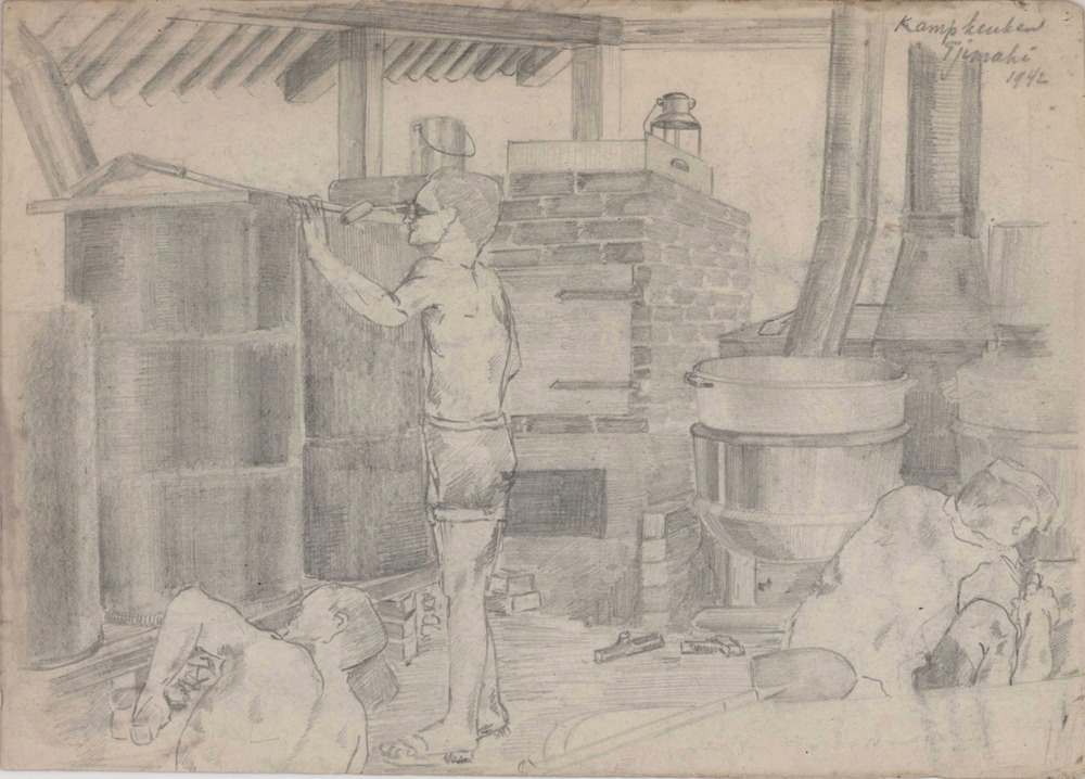 Kachels, haarden. De kolenkachel verwarmt twee pannen, links de kolenkit, Nederland 1942.