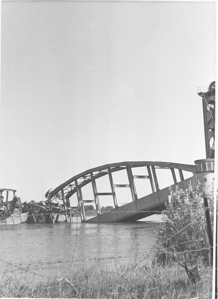 Zwolle, Katerveer. Op 10 mei 1940 werd de IJsselbrug door het Nederlandse leger vernield. De brug is in 1943 hersteld.