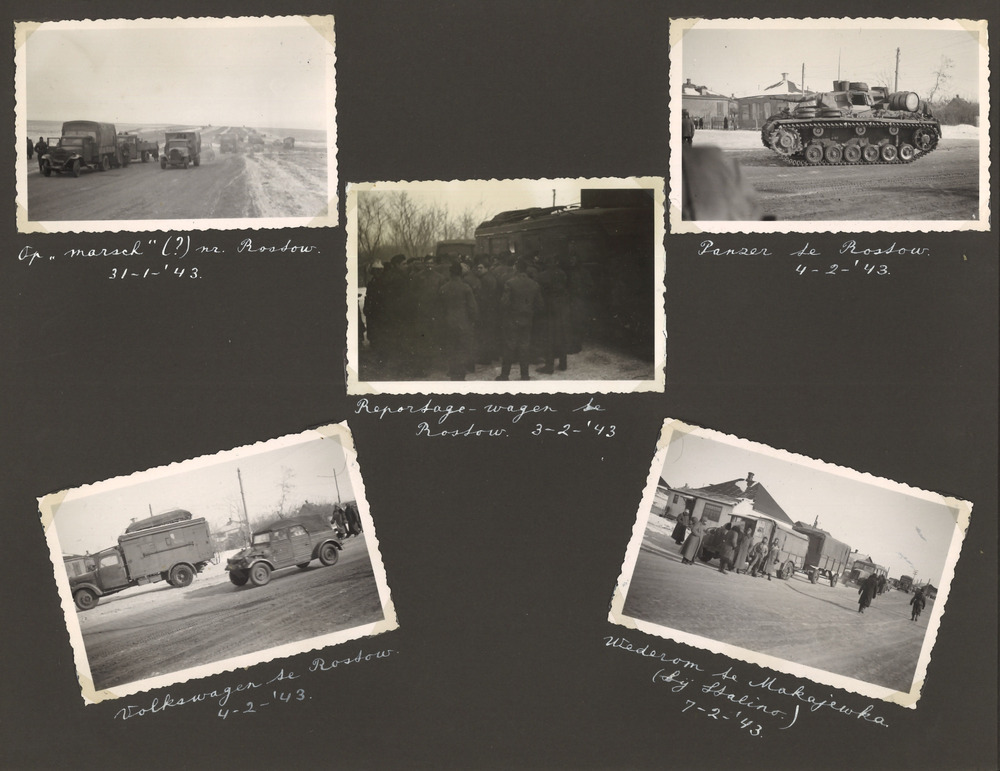 Pagina uit het fotoalbum van J.C. Beekhof. Beekhof wordt voor de oorlog lid van de NSB en maakt later deel uit van de Mussertgarde. Als lid van de WA volgt hij een opleiding in België aan de Motorschool en vertrekt naar Duitsland. Uiteindelijk komt Beekhof aan het Oostfront in de Sovjet Unie terecht, tot en met maart 1943. Af en toe is hij terug in België en Nederland. In april 1943 gaat hij met verlof in Nederland. Hier eindigt het album. W.A. en Duitsche Arbeidsdienstmannen in Litauen. Juli '41. Omgeving Butslau. (Rusl.) Aug. '41. Kameraadschap tusschen W.A. en Duitsche Arbeidsdienst.