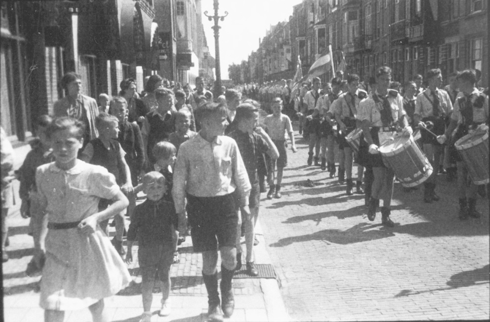 Foto: Parade van de Nationale Jeugdstorm, 'de Princevlag', een afdeling van de NJS, door de Amsterdamse Concertgebouwbuu...