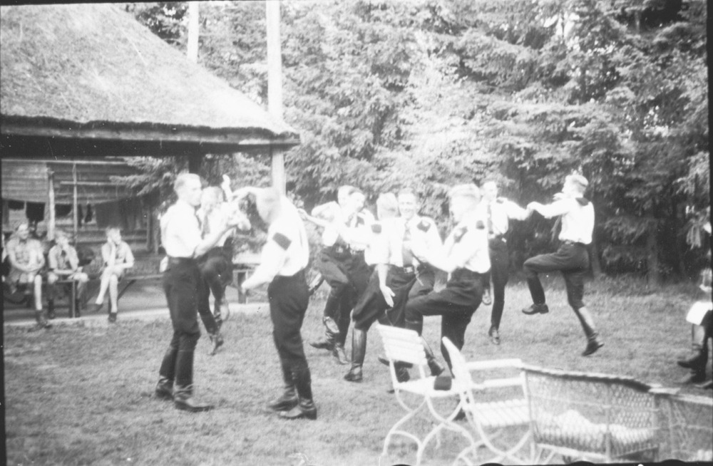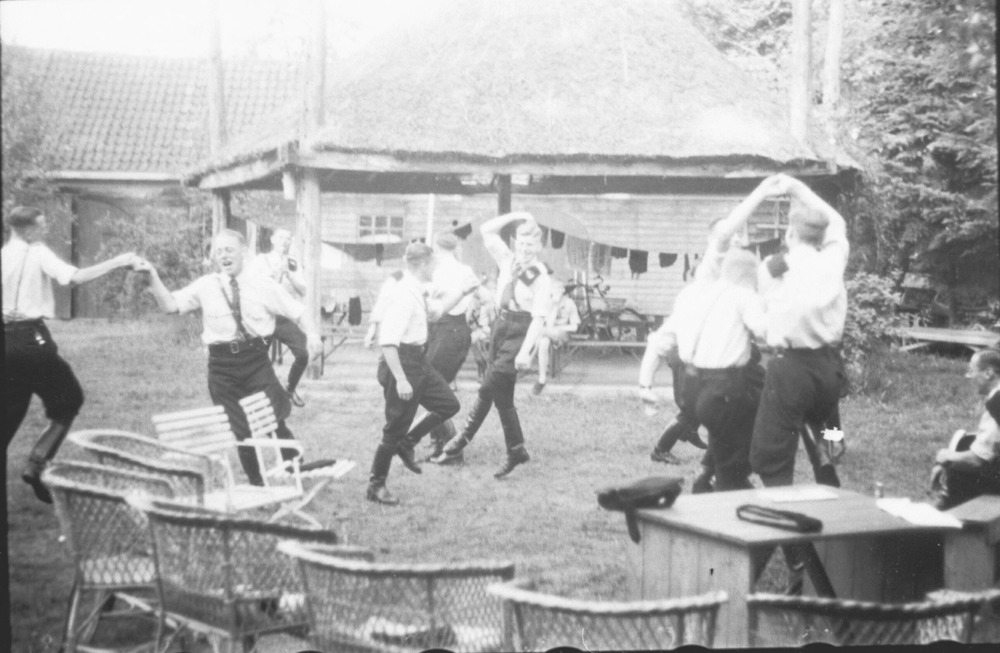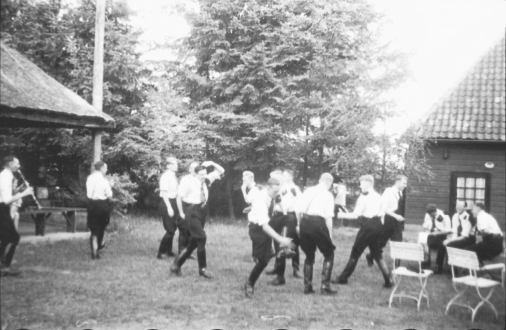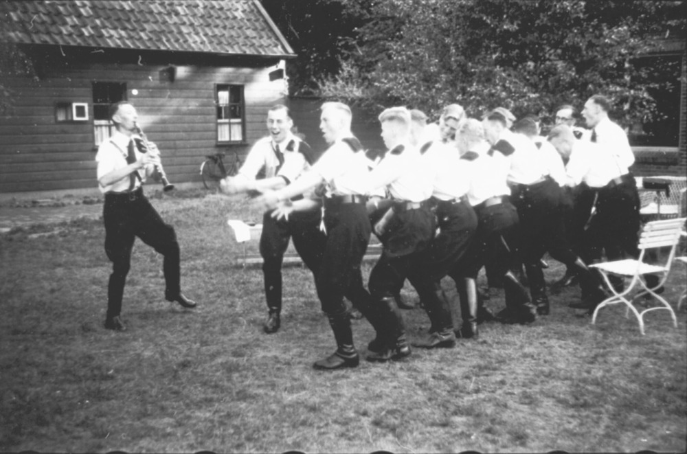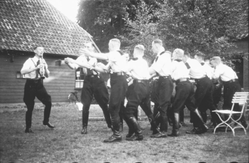 Foto: Dansende leden van de NJS op een boerderij. De jongerenorganisatie van de NSB, de Nationale Jeugdstorm (NJS), werd op 1 mei 1934 opgericht. Het lidmaatschap was op basis van vrijwilligheid. 'Arische' jongens en meisjes tussen de 10 en 18 jaar konden toetreden. Hoewel de Jeugdstorm de schijn probeerde op te houden een niet-politieke groepering te zijn, waren de ideeën grotendeels gebaseerd op de NSB-ideologie. Tijdens de bezetting streefden de Duitsers ernaar de NJS op te laten gaan in de Hitler-Jugend. Maar Mussert en 'hoofdstormer' C. van Geelkerken slaagden erin het nationale karakter van de jeugdorganisatie te bewaren. Op haar hoogtepunt telde de Jeugdstorm 16.000 leden.