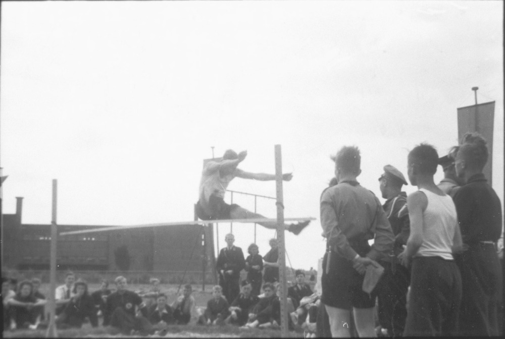Foto: Hoogspringen tijdens de sportmanifestatie tussen de Jeugdstorm en de Hitler Jugend.