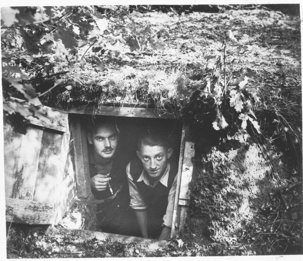 Verblijfplaats van twee onderduikers in een tent in een maisveld te Aalten. De tent werd later naar een bos overgebracht. Bezoeker meldt: De linker jongeman is J.H. Janssen jr., de jongste zoon van fotograaf J.H. Janssen uit Doesburg. De tent was nodig nadat de Duitsers, ze hadden op een konijntje geschoten wat in het bos vluchtte, gingen zoeken naar het konijn , maar ze vonden het onderduik hol. Het speelde zich allemaal af naast de boerderij, de Hiettuunte in Lintelo, van de oma van de beide broers. Ook Bertus Janssen woonde daar nog thuis. Tijdens de eerste fase van de bezetting waren slechts weinigen vertrouwd met het verschijnsel onderduiken. Bij gebrek aan onderduikorganisaties, was hetn iet eenvoudig adressen hiervoor te vinden. In principe kon een onderduikadres zich overal bevinden: op het platteland, in de bossen, in de stad of zelfs in de eigen woning. De omstandigheden voor onderduikers waren verre van ideaal. Van enige privacy was doorgaans nauwelijks sprake en na maanden, soms jaren van binnen zitten, vaak in kleine ruimtes op zolder of in de kelder, namen de spanningen toe. Constant was er het gevoel opgejaagd te zijn. Ook voor de gastgezinnen betekende het verlenen van onderdak aan onderduikers een zeer zware belasting.