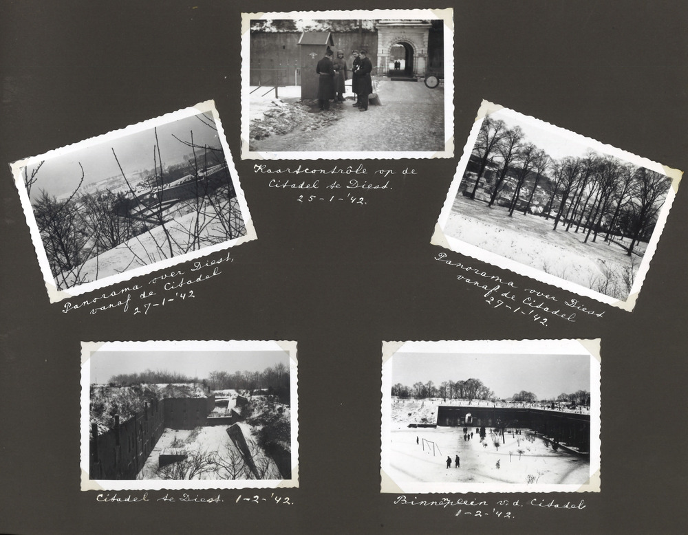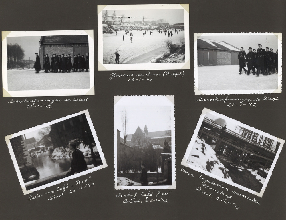 Pagina uit het fotoalbum van J.C. Beekhof. Beekhof wordt voor de oorlog lid van de NSB en maakt later deel uit van de Mussertgarde. Als lid van de WA volgt hij een opleiding in België aan de Motorschool en vertrekt naar Duitsland. Uiteindelijk komt Beekhof aan het Oostfront in de Sovjet Unie terecht, tot en met maart 1943. Af en toe is hij terug in België en Nederland. In april 1943 gaat hij met verlof in Nederland. Hier eindigt het album. Omgeving Butslaw. (Rusl.) Puinhopen. Aug. '41. Middageten te Parafijanowa (Rusl.) Juli-Aug. '41. Kameraden Bronsema Visser en Rademaker te Smolensk (Rusl.) Oct. '41. Hout zagen te Smolensk. Oct tot Dec. '41 (24 graden vorst.) Dirk Bothof in het bosch bij Smolensk Dec. '41. Hout hakken en zagen voor den nacht. Smolensk Dec '41 (24 graden vorst)