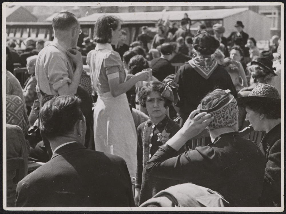 Amsterdam, Polderweg/ Muiderpoortstation. 26 mei. Deze foto werd gepubliceerd in Storm SS op 4 juni 1943 met een aantal anderen met de titel: Afscheid 1700 Joden, van de 7000 die zich moesten melden, geven gevolg aan de Duitse oproep ('Oproeping') en melden zich op 25 mei aan voor vertrek naar kamp Westerbork. Urenlang wachten zij op de speciale trein die hen vanaf Station Muiderpoort naar Westerbork zal vervoeren. Dit geringe aantal leidde tot grote irritatie van de Duitsers . Daarom volgde op 26 mei opnieuw een razzia waarbij 3300 mensen werden opgepakt. Lambertus Jasper de Kok, 1896 - 1972 De Kok was sinds 1940 NSB-lid en maakte vanaf 1941 foto's van grote en kleine politieke gebeurtenissen in opdracht van de Duitse bezettingsmacht en de Amsterdamse rechercheur Willem Klarenbeek, waardoor hij zaken fotografeerde die voor andere fotografen verboden waren. Van iedere foto maakte hij 2 afdrukken. De tweede bewaarde hij in het huis van vriend. In 1943 maakte hij een serie foto's van opgepakte joden in Amsterdam vlak voor hun transport. In 2010 werden ca. 250 van zijn foto;s uit 1941/ 1942 ontdekt. Enkele foto's uit de collectie waren al bekend door publicatie in de contemporaine pers, met name foto's van het oprollen van illegale slachterijen. Na de bevrijding kreeg de Kok een korte gevangenisstraf.