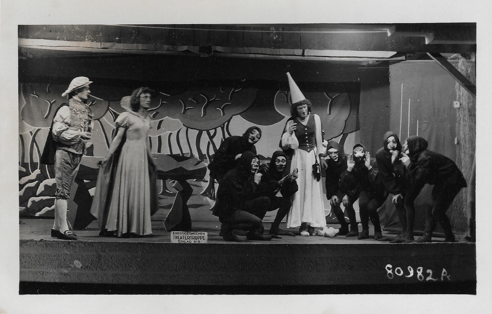 Foto nr. 11069 Het zwembad Collectie foto's over het krijgsgevangenenkamp Stalag IV B, Mühlberg a/d Elbe. Het kamp werd opgericht eind 1939 en werd bevrijd op 23 april 1945. Er zaten ca. 10 nationaliteiten vast. In juni/ juli 1943 arriveerden er een groep van 2300 Nederlanders. De Nederlandse militairen waren in april opgeroepen zich te melden om opnieuw in krijgsgevangenschap te gaan. Dit was de aanleiding tot de April-Mei stakingen. Uiteindelijk werden ruim 8000 militairen weggevoerd naar Duitsland. Vanaf ca. 1940 bezat het kamp een fotoafdeling waar 3 Fransen werkten. Zij moesten gebeurtenissen , werkplaatsen en begrafenissen fotograferen. Voorjaar 1944 werden ook drie Nederlanders aangesteld op de fotoafdeling: D. van Maarseveen, J. W. Adam en C. van Weele. Voordat zij deze baan kregen werkten ze in de keuken. Zij fotografeerden ook illegaal in het kamp. Het is nu niet meer na te gaan welke foto door welke fotograaf is gemaakt. J.W. Adam ( 194 - 1997) nam een grote collectie afdrukken mee terug naar huis. Hij was geen fotograaf maar hoofd boekhouder. Ook beide andere fotografen namen negatieven en afdrukken mee terug. D. van Maarseveen fotografeerde ook de bevrijding en de ingewikkelde reis terug naar Nederland.
