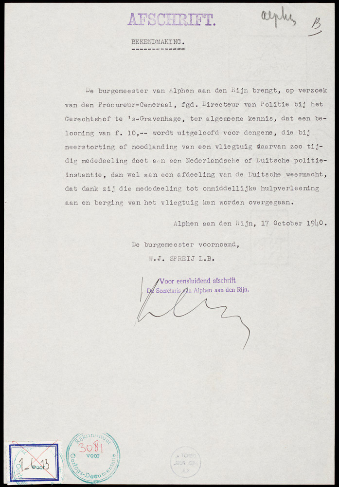 Op verzoek van den Proc.-Generaal, fgd. Directeur van Politie bij het Gerechtshof te 's-Gravenhage wordt ter algemeene kennis gebracht, dat een belooning van f 10,- wordt uitgeloofd voor dengene, die bij neerstorting of noodlanding van een vliegtuig daarv