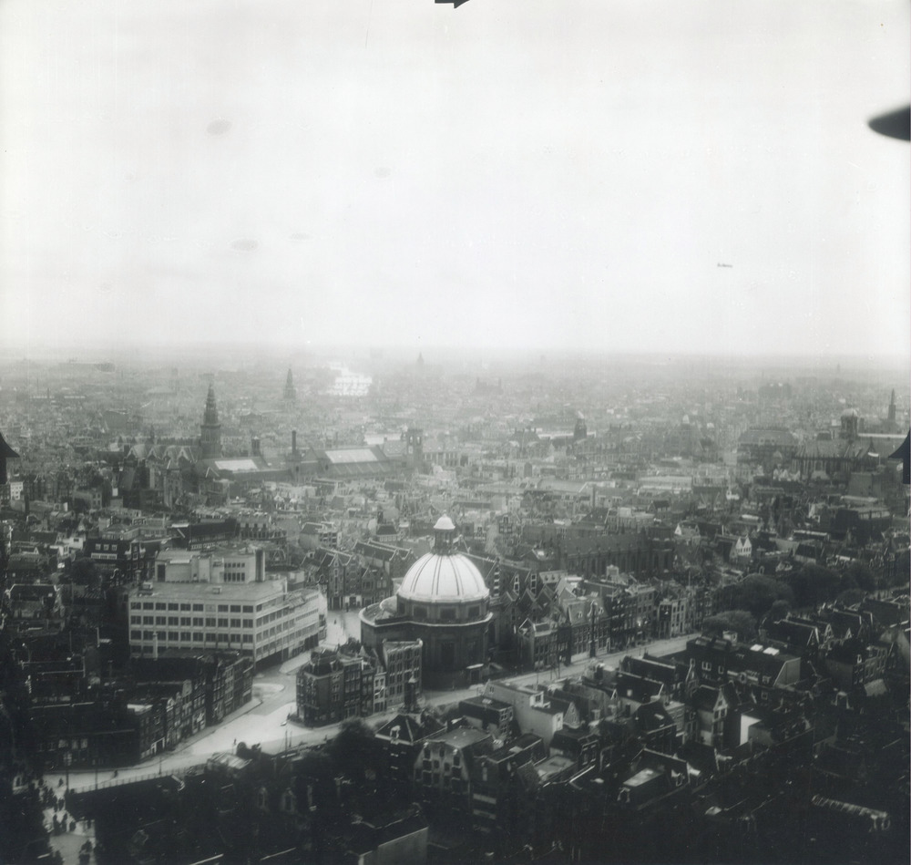 Luchtfoto van Amsterdam gemaakt door de US Airforce tijdens voedseldroppings eind april 1945. Het centrum van Amsterdam met links in het midden de Beurs van Berlage, en rechts in het midden de Dam.