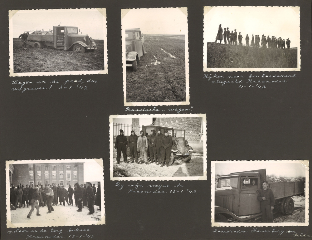 Pagina uit het fotoalbum van J.C. Beekhof. Beekhof wordt voor de oorlog lid van de NSB en maakt later deel uit van de Mussertgarde. Als lid van de WA volgt hij een opleiding in België aan de Motorschool en vertrekt naar Duitsland. Uiteindelijk komt Beekhof aan het Oostfront in de Sovjet Unie terecht, tot en met maart 1943. Af en toe is hij terug in België en Nederland. In april 1943 gaat hij met verlof in Nederland. Hier eindigt het album. De marsch te Diest. Mei '41. Leuven, Mei '41. Op marsch te Diest. Mei '41. Kolonnenfuhrer Baumann. Gezicht op Diest