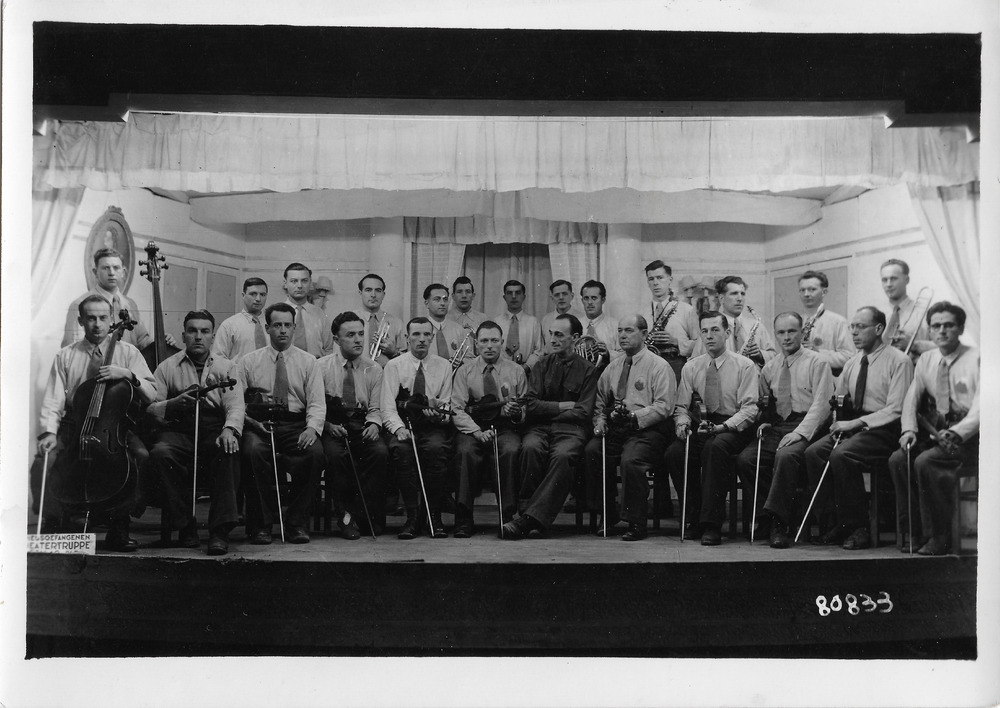 ( foto nr., 80833 ) Orkest van Franse? musici. . Collectie foto's over het krijgsgevangenenkamp Stalag IV B, Mühlberg a/d Elbe. Het kamp werd opgericht eind 1939 en werd bevrijd op 23 april 1945. Er zaten ca. 10 nationaliteiten vast. In juni/ juli 1943 arriveerden er een groep van 2300 Nederlanders. De Nederlandse militairen waren in april opgeroepen zich te melden om opnieuw in krijgsgevangenschap te gaan. Dit was de aanleiding tot de April-Mei stakingen. Uiteindelijk werden ruim 8000 militairen weggevoerd naar Duitsland. Vanaf ca. 1940 bezat het kamp een fotoafdeling waar 3 Fransen werkten. Zij moesten gebeurtenissen , werkplaatsen en begrafenissen fotograferen. Voorjaar 1944 werden ook drie Nederlanders aangesteld op de fotoafdeling: D. van Maarseveen, J. W. Adam en C. van Weele. Voordat zij deze baan kregen werkten ze in de keuken. Zij fotografeerden ook illegaal in het kamp. Het is nu niet meer na te gaan welke foto door welke fotograaf is gemaakt. J.W. Adam ( 194 - 1997) nam een grote collectie afdrukken mee terug naar huis. Hij was geen fotograaf maar hoofd boekhouder. Ook beide andere fotografen namen negatieven en afdrukken mee terug. D. van Maarseveen fotografeerde ook de bevrijding en de ingewikkelde reis terug naar Nederland.