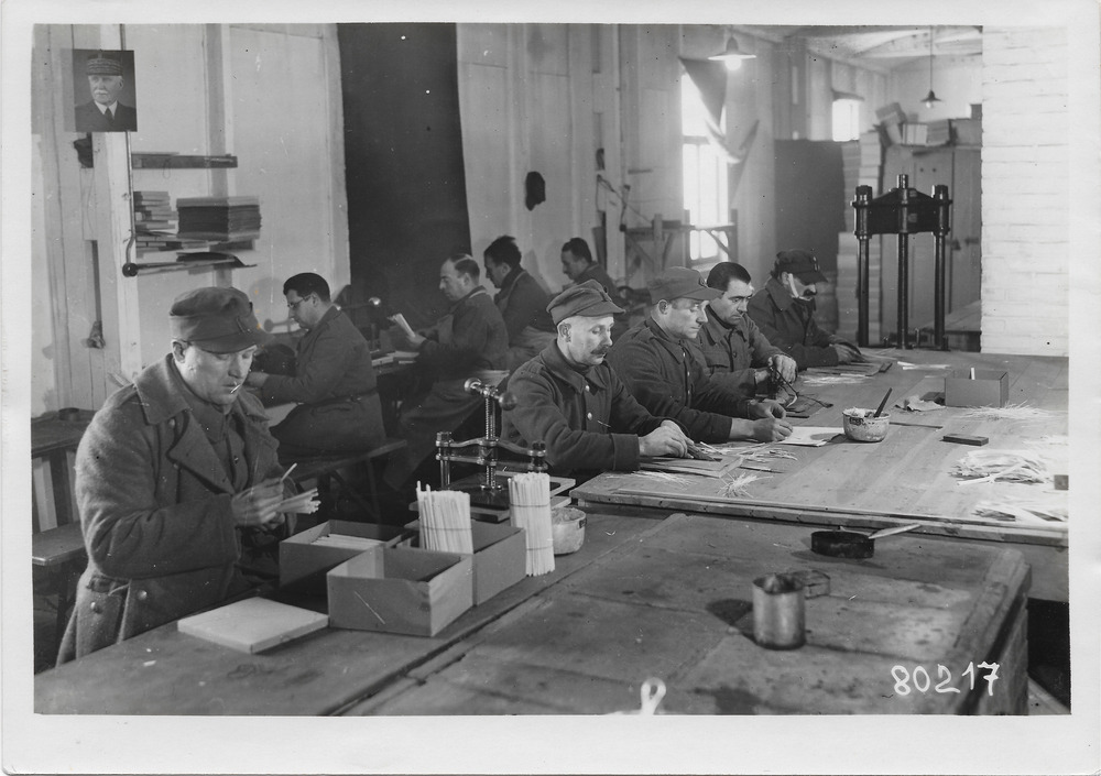 Foto nr. 13478 Vermodelijk Russische krijgsgebangenen verzamelen stro ( of hooi ) voor matrassen. Duitse militairen houden toezicht. Collectie foto's over het krijgsgevangenenkamp Stalag IV B, Mühlberg a/d Elbe. Het kamp werd opgericht eind 1939 en werd bevrijd op 23 april 1945. Er zaten ca. 10 nationaliteiten vast. In juni/ juli 1943 arriveerden er een groep van 2300 Nederlanders. De Nederlandse militairen waren in april opgeroepen zich te melden om opnieuw in krijgsgevangenschap te gaan. Dit was de aanleiding tot de April-Mei stakingen. Uiteindelijk werden ruim 8000 militairen weggevoerd naar Duitsland. Vanaf ca. 1940 bezat het kamp een fotoafdeling waar 3 Fransen werkten. Zij moesten gebeurtenissen , werkplaatsen en begrafenissen fotograferen. Voorjaar 1944 werden ook drie Nederlanders aangesteld op de fotoafdeling: D. van Maarseveen, J. W. Adam en C. van Weele. Voordat zij deze baan kregen werkten ze in de keuken. Zij fotografeerden ook illegaal in het kamp. Het is nu niet meer na te gaan welke foto door welke fotograaf is gemaakt. J.W. Adam ( 194 - 1997) nam een grote collectie afdrukken mee terug naar huis. Hij was geen fotograaf maar hoofd boekhouder. Ook beide andere fotografen namen negatieven en afdrukken mee terug. D. van Maarseveen fotografeerde ook de bevrijding en de ingewikkelde reis terug naar Nederland.