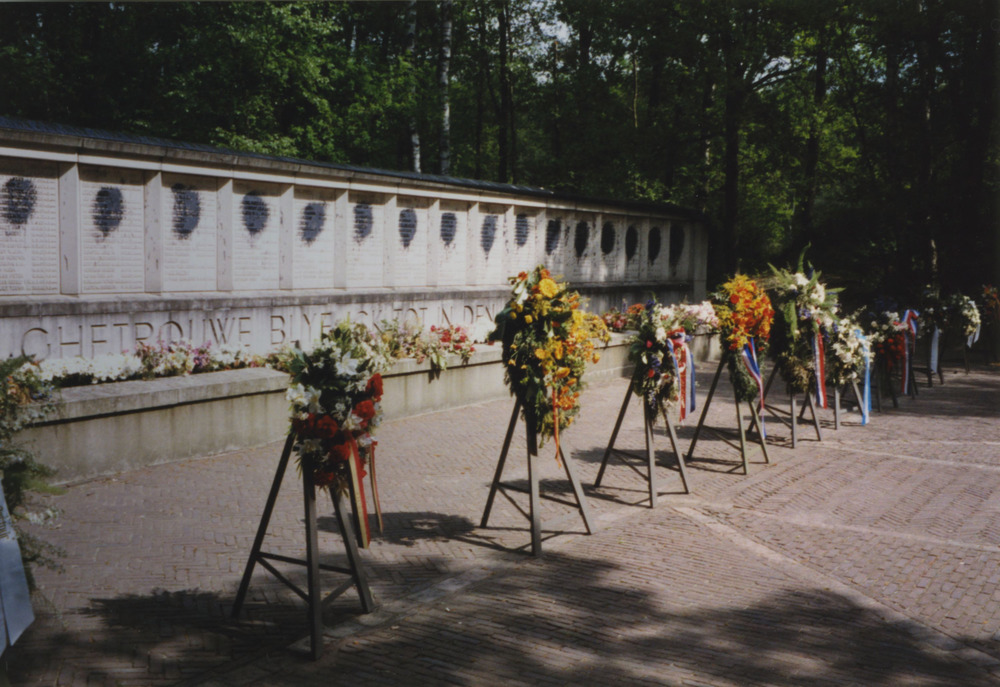 Foto afkomstig uit een Album met foto's uit de jaren 90 van het Nationaal Monument Kamp Vught; 'op 6/7 mei 1995 beschadigd monument met kransen en bloemen'