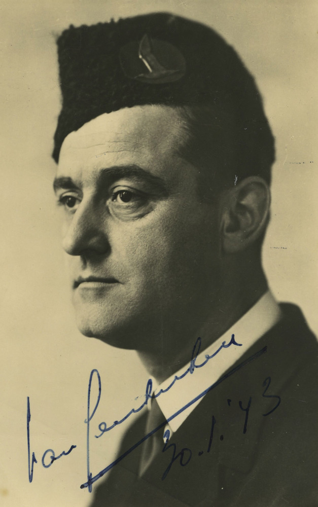 Gesigneerde foto van van Geelkerken. 'Van Geelkerken, 30.1.'43.' Op de achterzijde staan diverse handtekeningen.