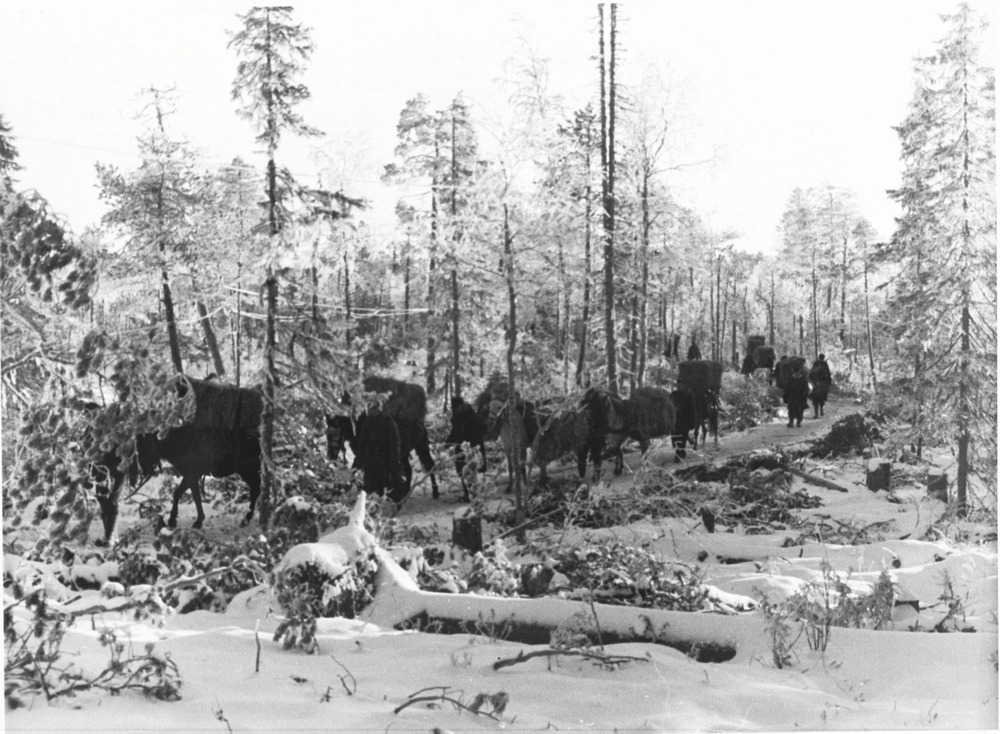 Gebirgsjäger der Waffen-SS im hohen Norden verlasten winterfutter für die Tragtiere. Wo nur verschneite Knüppeldämme durch den verschneiten Urwald führen, werden die Futtermittel für die Pferde und Maultiere einer Gebirgsjägereinheit mit Tragtierkolonnen und Schlitten weiter transportiert.