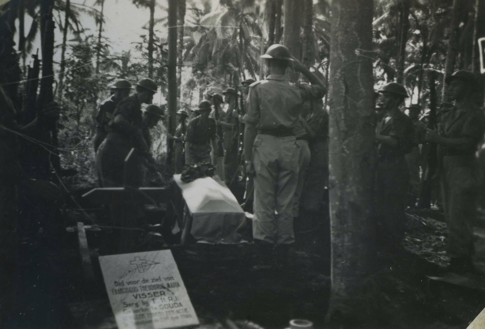 Een foto uit een fotoalbum van dhr T. Smid, die als ziekenverzorging bij de 7 december divisie naar Nederlands-Indië was gezonden van 1946 tot 1950. Hij zat bij de afdeling derde hulp verbandplaats. 'Waar wij werken: 9. Het pad naar de verblijven, keuken en eetzaal.'