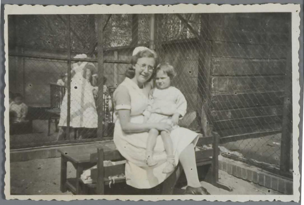 Kinderverzorgster Hetty van Opstal met het jongetje Robbie de Jong in de creche aan de Plantage Middenlaan in Amsterdam, circa 1942