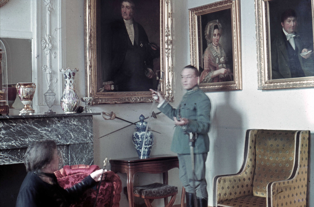 Reserve-officier Louis Hustinx tijdens de beztting binnenshuis in uniform in huize Hustinx .
