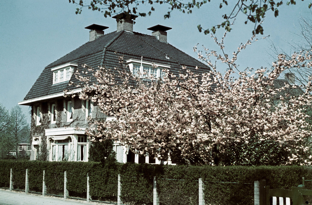 Herenhuis met rieten dak en luiken (als boerderij) met boom in bloei. Het getoonde pand is Hogeweg 37 in Velp-Gelderland