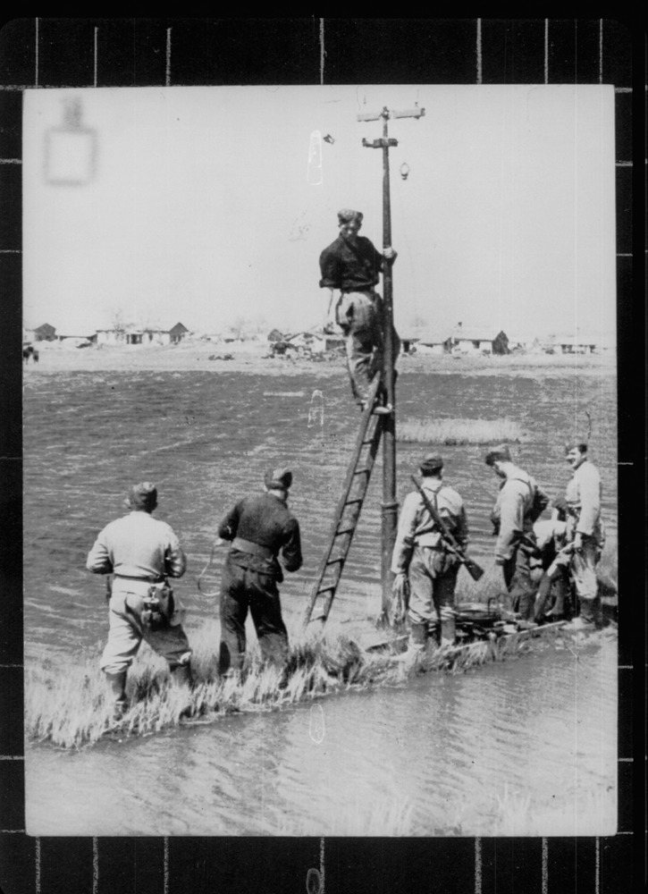 Brückenbaupioniere - Helfer des Nachschubs. Noch stehen erst die Brückenpfeiler, aber in wenige Tagen werden bereits die ersten Kolonnen über die fertige Fahrbahn rollen. Bis dahin dienen noch Pontonbrücke und Holzsteg für Fahrzeuge und Fussgänger als Stromübergang.