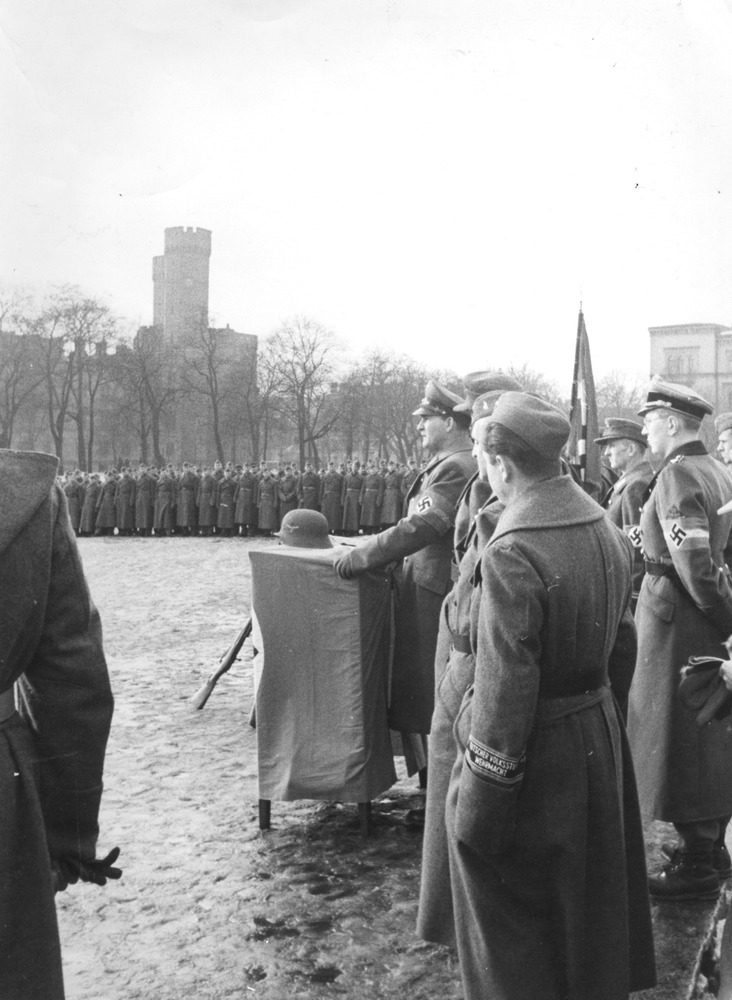 Die ersten Bilder aus der Festung Breslau. Gauleiter und Reichsverteidigungskommissar Hanke unter seinen Breslauer Volkssturmmännern.