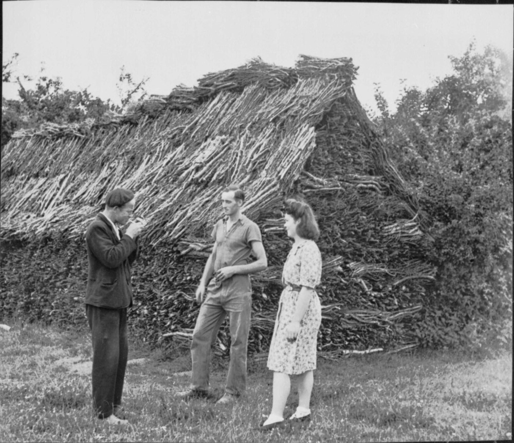 U.S. pilot hidden in Woodpile by French underground. After Marcei was liberated by the Americans, Lieutenant Moore was free to return to his own squadron, where U.S. correspondents heard his story. Around the military stove are, left to rigt: Moore, Sergeant Joseph N. Walker of McGee, Mississippi, Alfred Bourguignon and Sergeant Gerard Gonier of Gardner, Massachusetts.