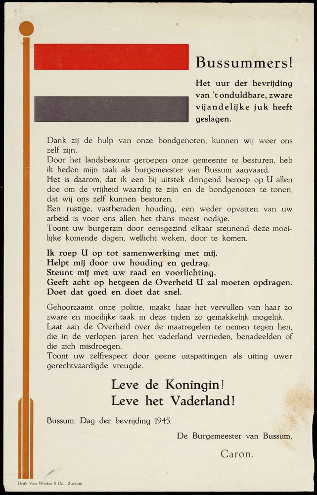 Zeeuwen ! Het zoo vurig en langverbeide uur der bevrijding heeft geslagen. Ons dierbaar gewest is aan de snel afnemende macht van den wreeden overweldiger ontrukt en zal kunnen herademen van de harde slagen,die het, vooral ook in de laatste weken, voor het herwinnen van recht en vrijheid heeft moeten verduren. Die¿..