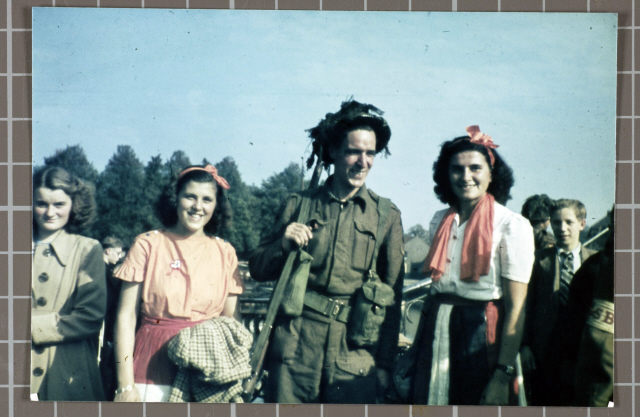 De zussen Gerda en Tinie Breukers, voor deze gelegenheid uitgedost in oranje en rood-wit-blauw met soldaten bij de brug over de Zuid-Willemsvaart te Weert.