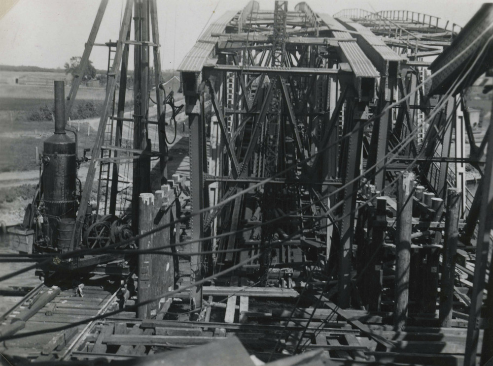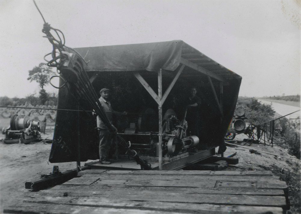 Door middel van een mobiele stoomlier takelen medewerkers van Gusto Staalbouw zware brugdelen Foto uit een album met 114 foto's betreffende de werkzaamheden door Gusto Staalbouw aan diverse in 1940 vernielde dan wel verwoeste objecten zoals spoor- en verkeersbruggen en een sluis. De werkzaamheden aan de spoorbrug Moeselbrug en Sluis No. 16 in de Zuid-Willemsvaart bij Weert en aan de twee spoorbruggen (kanaal Wessem-Nederweert) en de verkeersbrug in Kelpen worden uitgebreid in beeld gebracht.