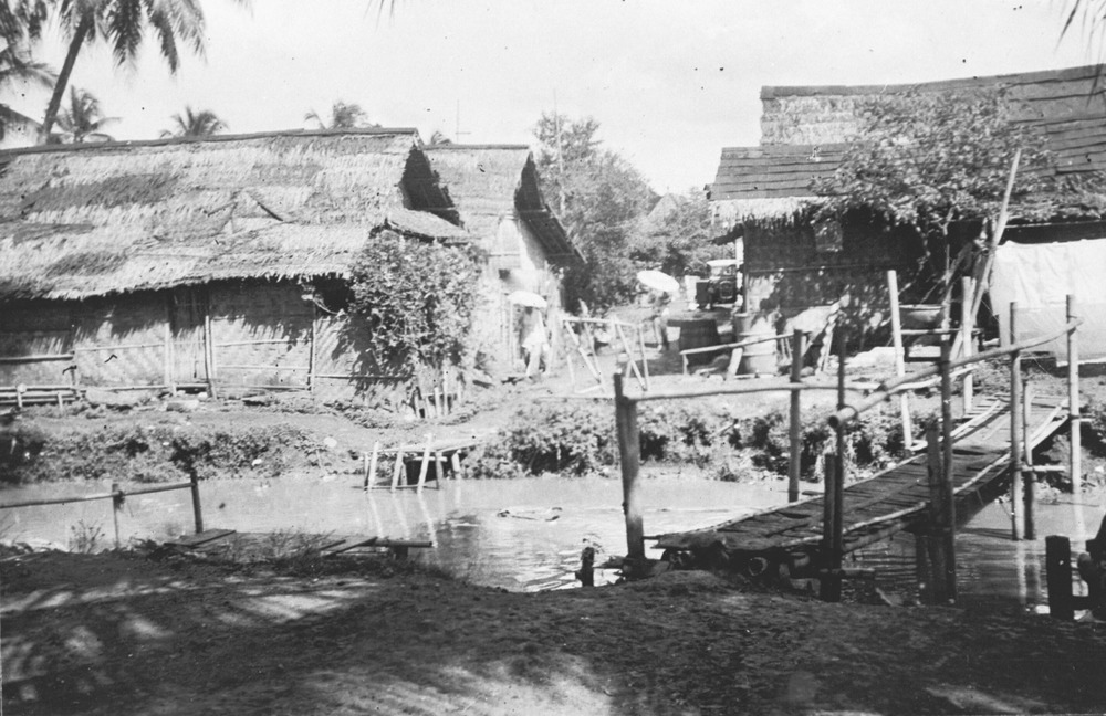 The 'Kampong'shown on NI 61 after improvement by the Netherlands Indies government Houses are rebuilt, the small bamboo-bridge is replaced by modern concrete construction. The small roads ere cemented and alongside watepipes are made. NI 60