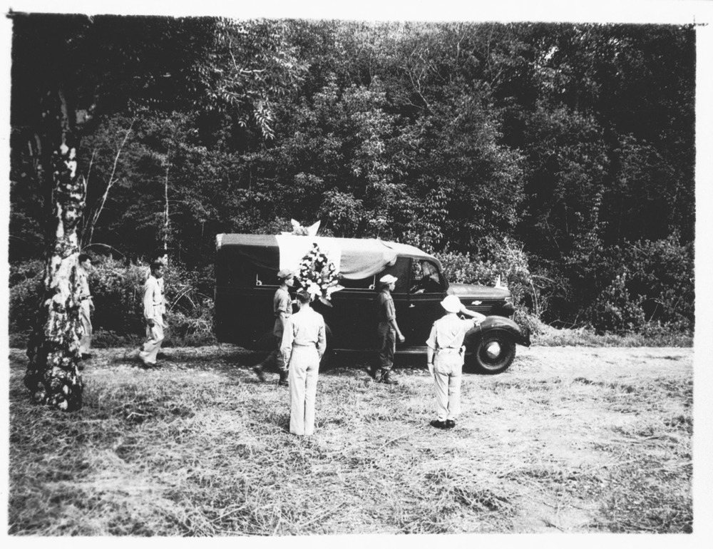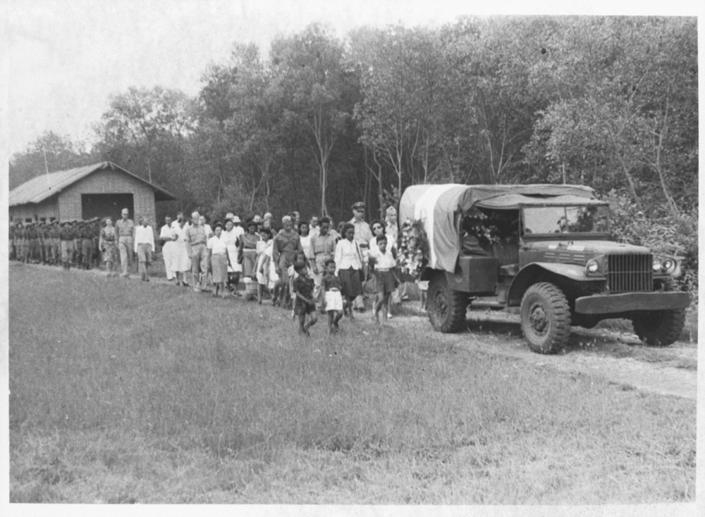 Ereveld Antjol te Djakarta. Begrafenis-plechtigheid en herdenking van de ge-executeerde verzetsleden.