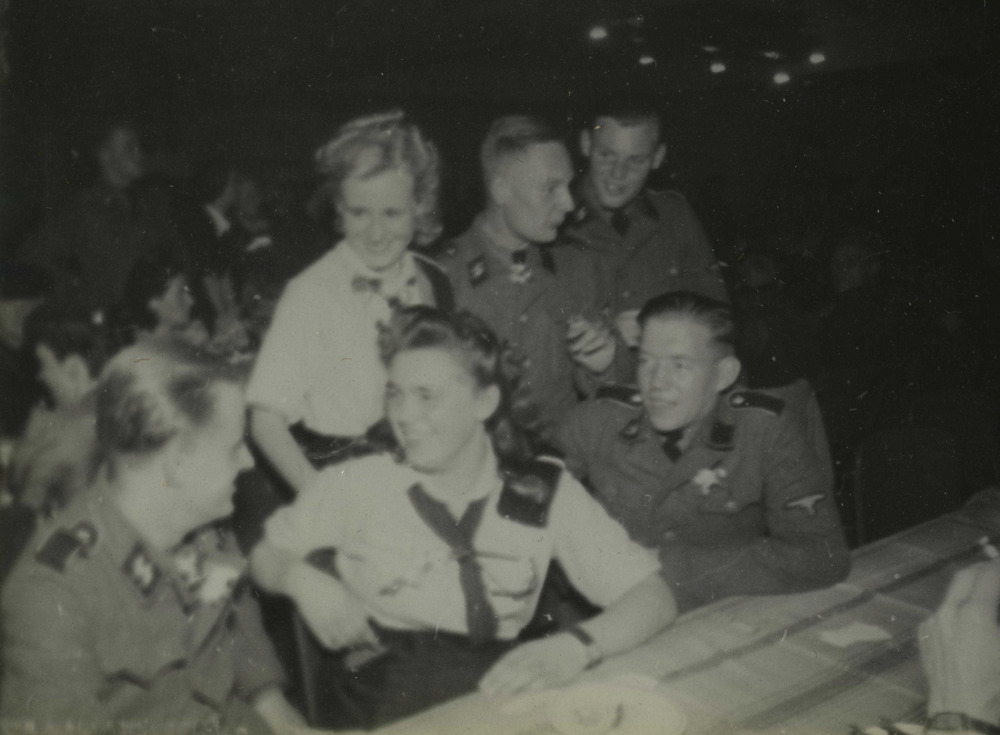 Bijeenkomst in Bellevue voor leden en hun familie, van het Vrijwilligerslegioen Nederland met verlof. Cino, G.H. 1894 – 1967. Cino werkte sinds midden jaren ’20 voor Het Leven. In december 1940 was Cino lid geworden van de NSB. Het Leven werd eind 1941 opgeheven en in juli 1942 krijgt Cino een baan bij de Fotodienst der N.S.B. Zijn foto’s verschijnen in Volk en Vaderland, Fotonieuws, de Zwarte Soldaat en Storm SS. Op 28 mei 1945 werd hij gearresteerd.