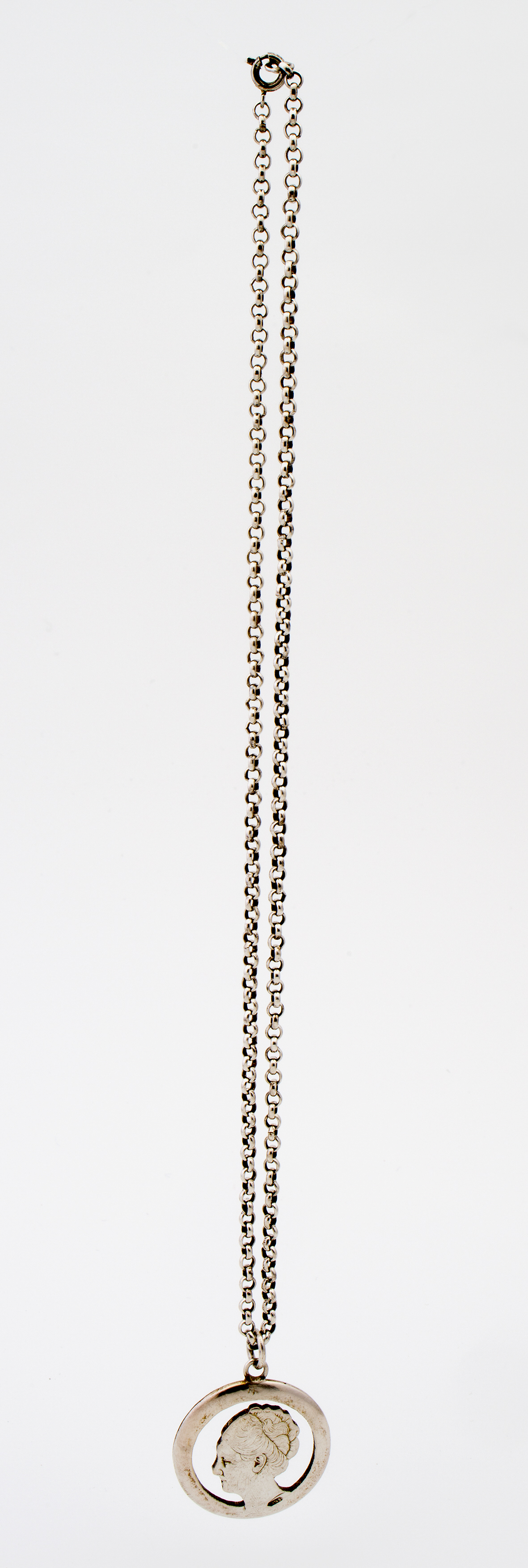 Deze hanger is kunstig vervaardigd uit een Nederlandse Rijksdaalder, waarbij het wapen van Nederland zorgvuldig is uitgezaagd om een uniek en symbolisch sieraad te creëren. Het uitzagen van dergelijke details vereiste niet alleen vakmanschap maar ook geduld en precisie, waarmee de maker niet alleen zijn of haar technische vaardigheden tentoonspreidde, maar ook een diepe nationale trots en verbondenheid met het land en zijn symbolen. Het vervaardigen van sieraden uit Nederlandse munten tijdens de bezetting in de Tweede Wereldoorlog was een vorm van lijdzaam verzet tegen de bezetter. Door munten, die vaak al snel uit de roulatie werden gehaald, om te toveren in dagelijks gedragen sieraden, behielden Nederlanders een stukje van hun identiteit en cultuur. Daarnaast diende het dragen van dergelijke sieraden als een subtiel teken van koningsgezindheid en loyaliteit aan het Huis van Oranje, in een tijd waarin openlijke uitingen van dergelijke sentimenten gevaarlijk konden zijn. Deze hanger symboliseert dus niet alleen persoonlijke versiering maar staat ook voor de veerkracht, creativiteit, en het onverzettelijke verzet van de Nederlandse bevolking onder moeilijke omstandigheden. Het is een tastbaar bewijs van de slimme manieren waarop men probeerde de cultuur en het erfgoed levend te houden, evenals de persoonlijke en collectieve hoop op een toekomst vrij van bezetting en onderdrukking.