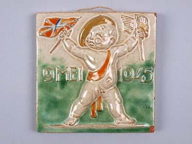 Tegel met beeltenis van naakt kind met vlaggen van de geallieerden 9 Mei 1945