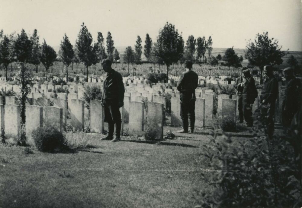 Groep Duitse miliairen bezoekt begraafplaats Eerste Wereldoorlog. Jaar en plaats onbekend.