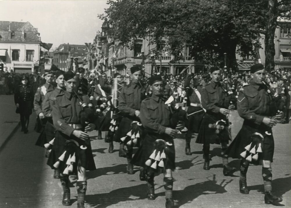 Op 13 mei 1945 was er een grote 'Churchparade' door de Friese hoofdstad ter gelegenheid van de dankdienst van Canadezen en verzet in de Grote Kerk. De parade werd afgenomen door de Canadese kolonel H.G. Sandercock samen met Nederlandse autoriteiten. De dienst stond onder leiding van legerpredikant Andrews en de hervormde ds. G. Gerbrandy. Het thema was: 'Hij is onze vrede'. Hier passeert de 'Pipes and Drumband' de 'Beurs'.