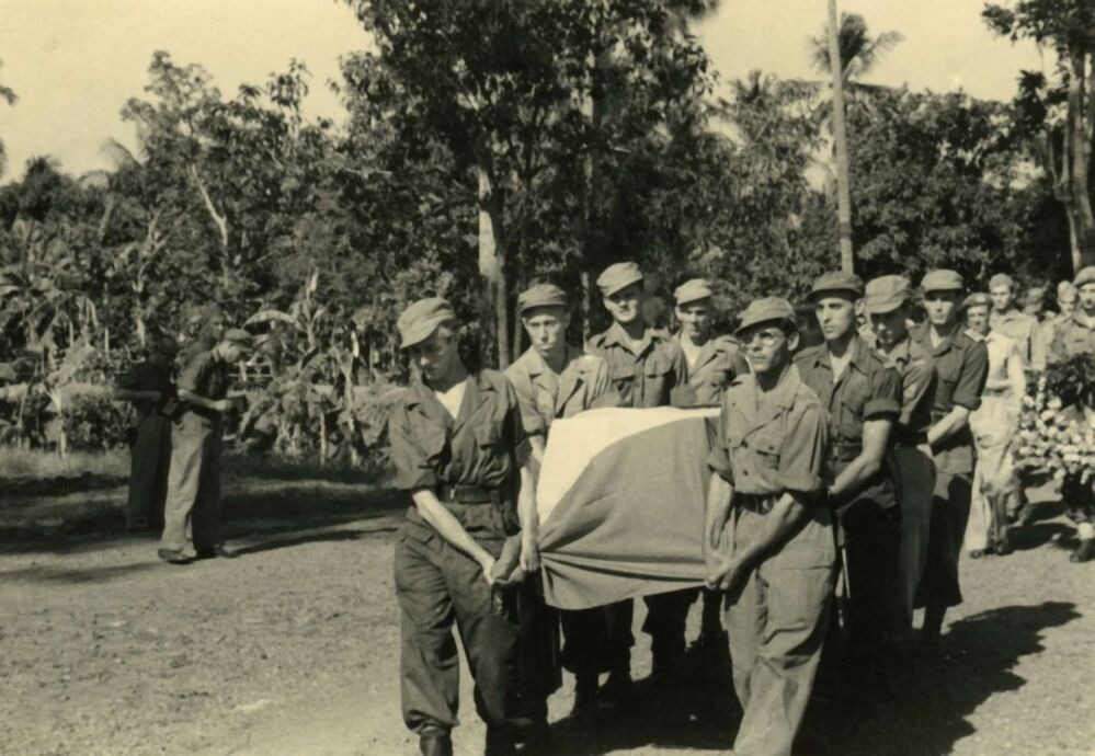 Direct na de Tweede Wereldoorlog werden er Nederlandse militairen ingezet tijdens de onafhankelijkheidsstrijd in het toenmalige Nederlands Indië. Hier wordt een gesneuvelde militair door zijn kameraden naar zijn laatste rustplaats gedragen.