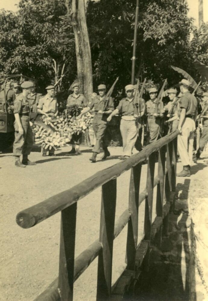 Direct na de Tweede Wereldoorlog werden er Nederlandse militairen ingezet tijdens de onafhankelijkheidsstrijd in het toenmalige Nederlands Indië. Hier passeert een begrafenisstoet een brug op een ereveld. De militairen die aan het hoofd lopen dragen de kransen.