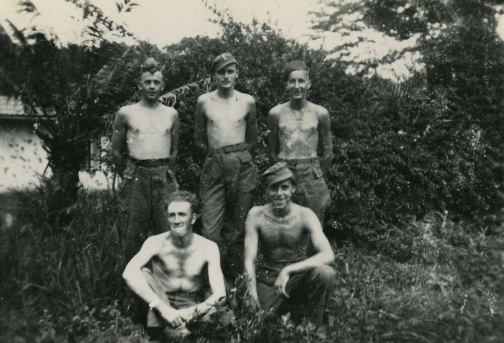 Direct na de Tweede Wereldoorlog werden er Nederlandse militairen ingezet tijdens de onafhankelijkheidsstrijd in het toenmalige Nederlands Indië. Hier poseren drie vrienden van het derde peleton voor de fotograaf. Hun namen zijn niet bekend.
