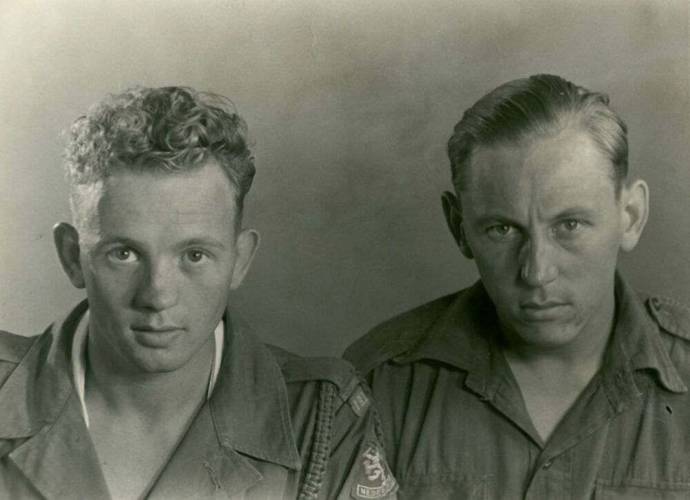 Direct na de Tweede Wereldoorlog werden er Nederlandse militairen ingezet tijdens de onafhankelijkheidsstrijd in het toenmalige Nederlands Indië. Hier poseren twee militairen voor de fotograaf. Hun namen zijn niet bekend.