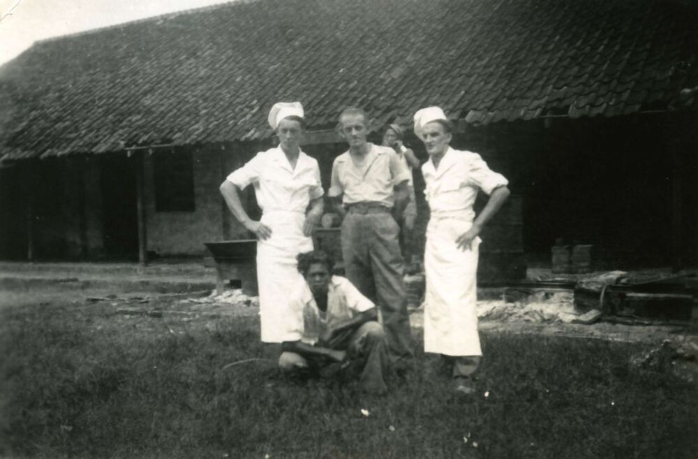 Direct na de Tweede Wereldoorlog werden er Nederlandse militairen ingezet tijdens de onafhankelijkheidsstrijd in het toenmalige Nederlands Indië. Hier poseren twee koks, één maat en een inlander voor de fotograaf. Hun namen zijn niet bekend.