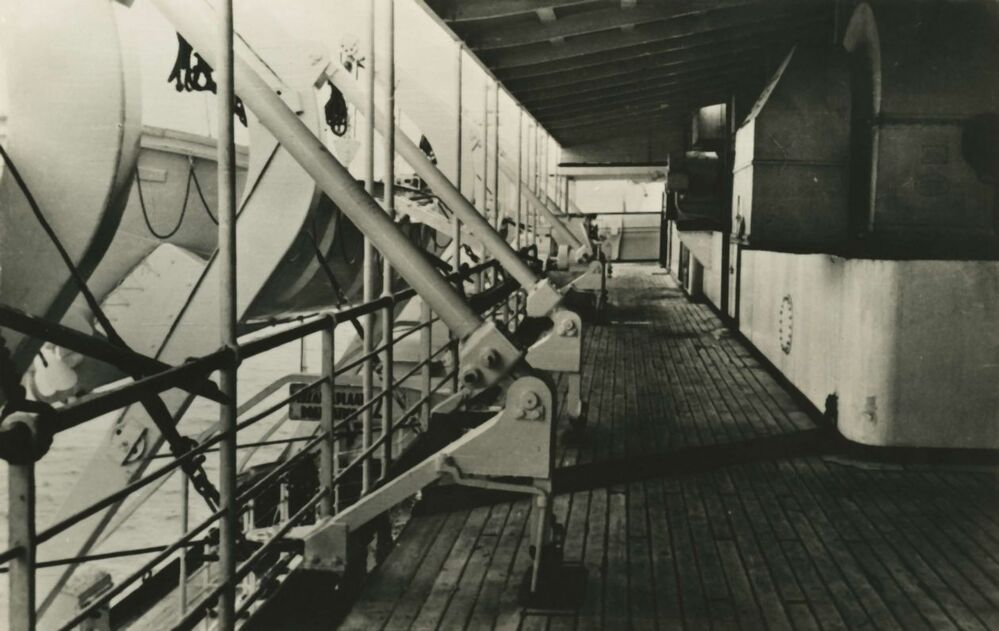 Deze opname is afkomstig uit de korte fotoreportage van het vetrek der 7 December Divisie. Met het 'Motorschip Ruijs' werd de reis van Amsterdam naar Batavia gemaakt. 'Het sloependek ligt stil en verlaten, want niemand mag er komen'.